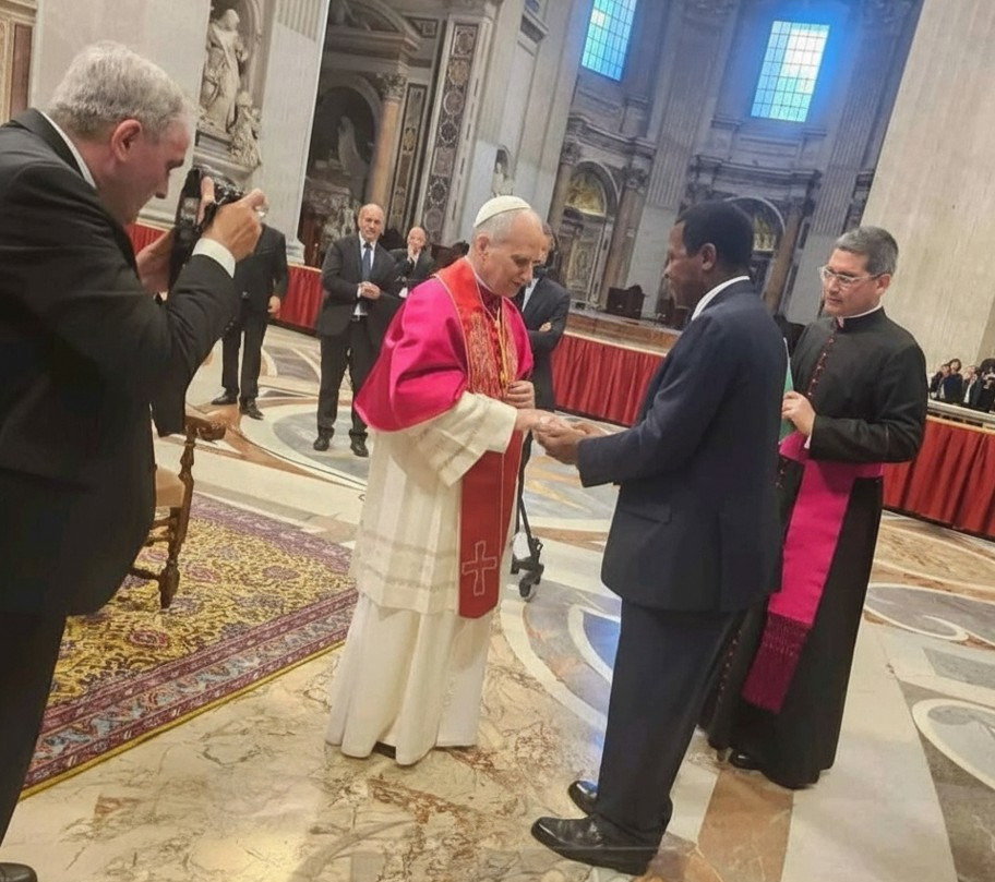 Minister Atanga Nji receiving blessings blessings from Pope Leo XIV after the inaugural mass in Rome, May 2025 as he represented President Paul Biya.
